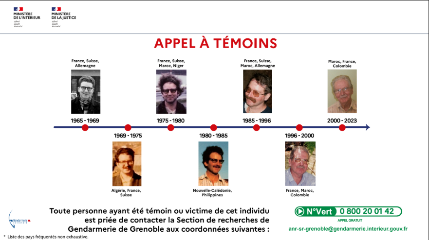 La clé USB sur laquelle des documents écrits ont été enregistrés par le septuagénaire a été découverte par son neveu qui se « questionnait sur la vie affective et sexuelle » de son oncle, a ajouté Etienne Manteaux. Il s’agit d’un document de « 15 tomes, une matière très dense », a-t-il précisé. La personne suspectée, Jacques LEVEUGLE, 79 ans, a séjourné durant son parcours dans de nombreux pays exerçant au sein d’associations ou d’établissements scolaires en tant qu’éducateur, moniteur de spéléologie, professeur de français… Dans ce cadre, afin d’identifier des victimes que l’auteur n’aurait pas mentionnées, mais aussi d’éclairer les zones d’ombres subsistant dans le parcours du suspect, la section de recherches de GRENOBLE et le groupement de gendarmerie de l’ISERE (38) lancent un appel à témoins. Toute personne ayant été témoin ou victime des agissements du mis en cause sont priés de contacter sans tarder la gendarmerie. « Le temps joue contre nous », a précisé le colonel Procédès, évoquant des faits pouvant être prescrits, antérieurs à 1993. Le procureur a lancé un appel à témoins « pour permettre à d’éventuelles autres victimes de pouvoir se manifester ». Au cours de l’enquête, il a admis avoir étouffé à l’aide d’un coussin sa mère, qui souffrait d’un cancer en phase terminale dans les années 1970, puis sa tante, âgée de 92 ans, dans les années 1990, en l’étouffant également avec un coussin, a précisé le procureur. Concernant sa tante, « parce qu’il devait repartir dans les Cévennes et qu’elle le suppliait de ne pas partir, il a fait le choix de lui donner la mort également et donc profitant de son sommeil a pris un coussin et l’a étouffée », a indiqué le procureur. Une enquête distincte de celle sur les viols et agressions sexuelles a été ouverte pour ces deux faits, « là aussi tout à fait reconnus et admis » par le prévenu.